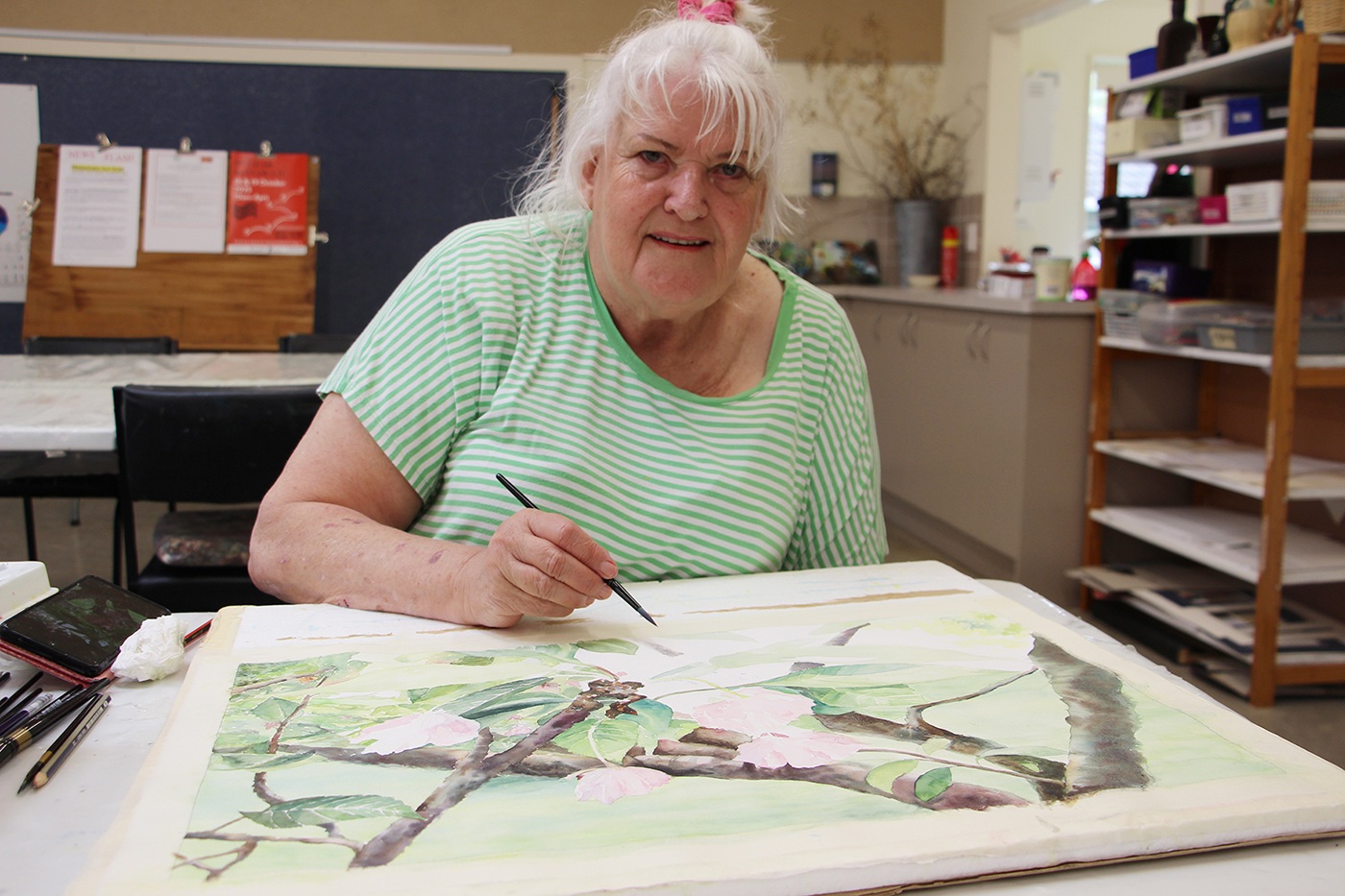 Horowhenua Art Society member Candy Summer works on a watercolour painting. Photo Janine Baalbergen