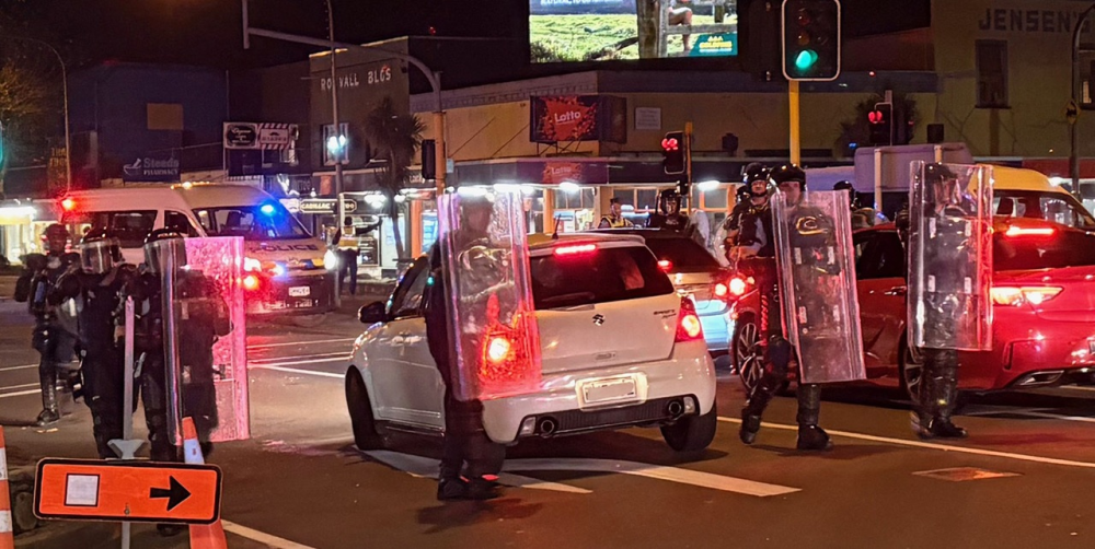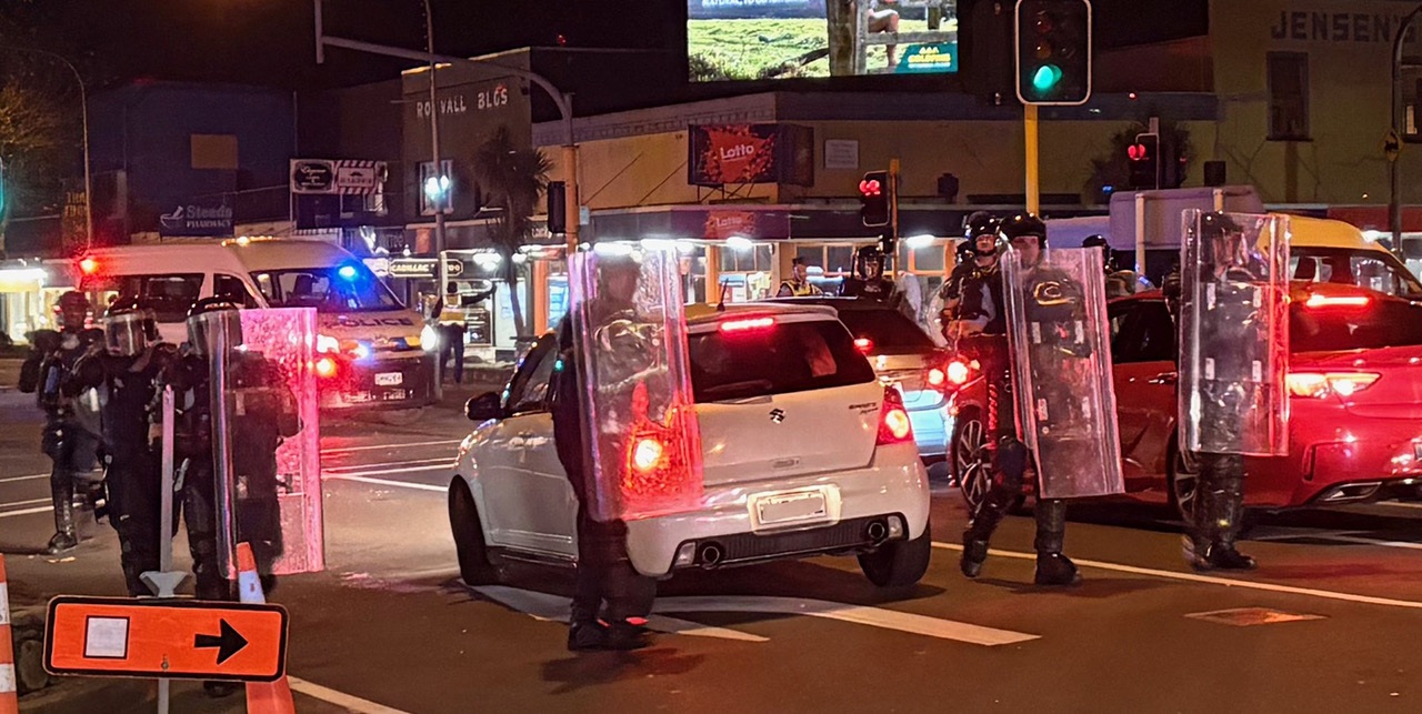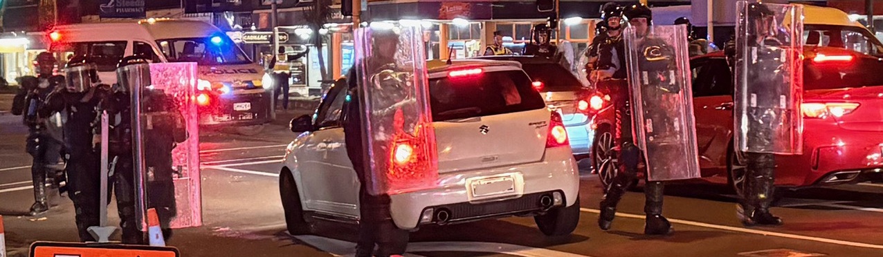 A similar gathering in May this year (photo above) involved the Armed Offenders Squad and Eagle helicopter. Fireworks were again thrown at police, and a car was used aggressively against police as they tried to disperse the crowd.