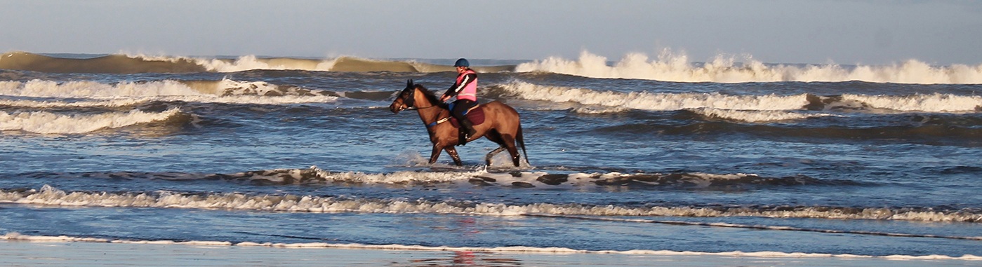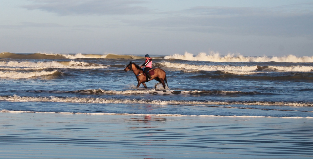 Ange Greig likes to keep her horses happy – and herself too – with regular trips to the beach. She goes early. The sun is just poking up over the Tararuas. The horses trot and canter along the sand near the water’s edge and when it’s time to cool down they have a walk in the water.