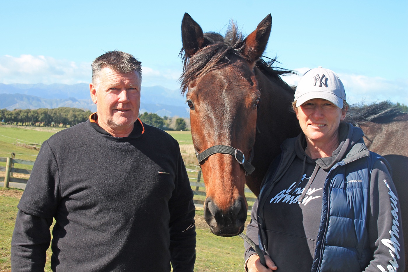 Ange and Pete Greig with Primo Attitude, who lines up at the Ōtaki-Māori meeting on Saturday (September 6). Photo Paul Williams